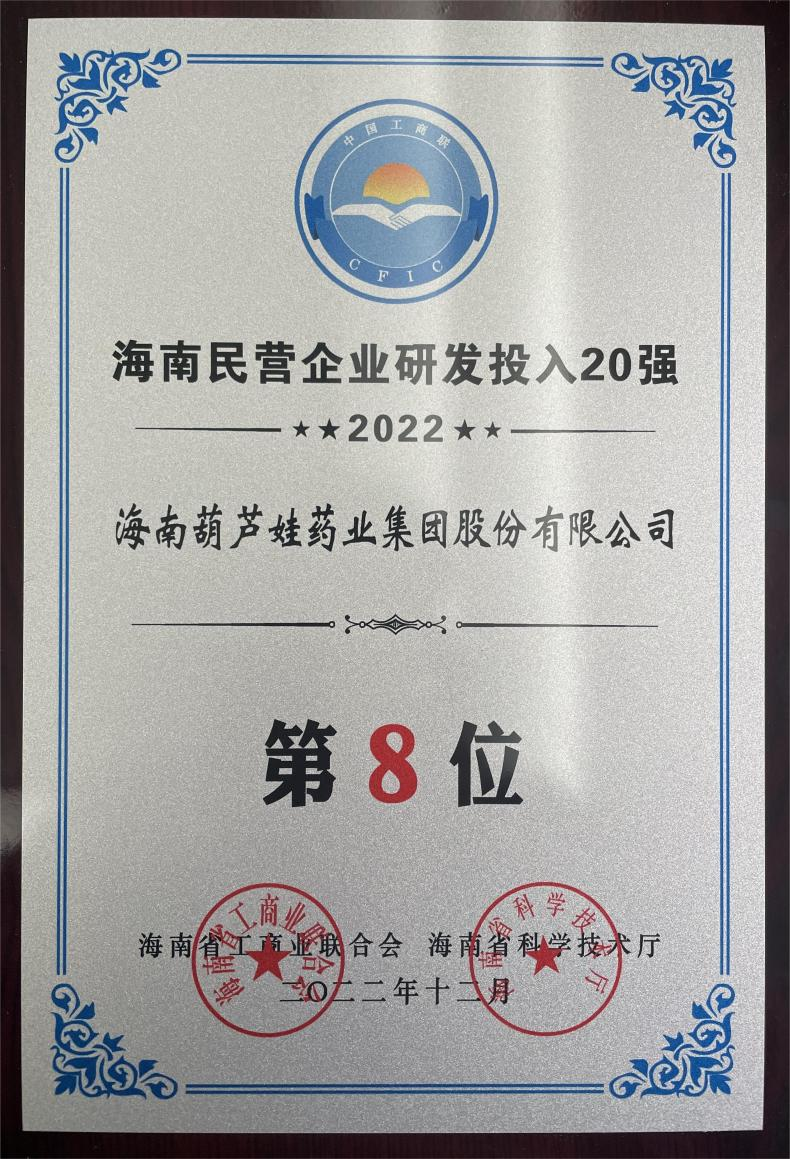 12月23日,2022海南民营企业50强和研发投入20强发布会在海口举行。会上发布了“2022海南民营企业50强”“2022海南民营企业研发投入20强”榜单和分析报告。门徒娱乐药业再次荣登两榜,在海南民营企业50强榜单中位列第25位,较去年上升8位,这也是公司连续三年登榜;在海南民营企业研发投入20强中位列第8位,较去年上升7位。